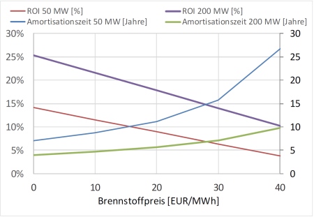 Brennstoffpreis: Der Einfluß des Brennstoffpreises auf die Wirtschaftlichkeit wird in folgender Abbildung dargestellt. Bei Brennstoffpreisen unter 15 EUR/MWh ist davon auszugehen, dass es sich um Brennstoffe niedrigerer Qualität handelt, darüber wird es sich sehr wahrscheinlich um Biomasse handeln. Insofern ist der Bereich unter 15 EUR/MWh am jeweiligen Standort zu prüfen. Brennstoffe minderer Qualität können nämlich Anpassungen in der Anlagentechnik erfordern, wie z.Bsp. Fördertechnik, Gasreinigung, usw. In diesem Fall würden sich die Invest- und evtl. auch Betriebskosten ändern, was wiederum die Wirtschaftlichkeit verschlechtern würde.
